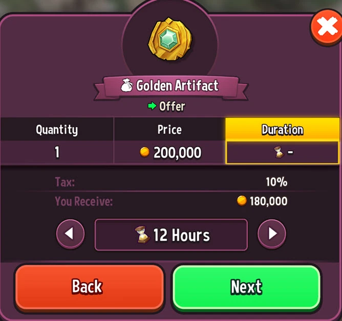 Each item will display a base value in gold. The selling price can be changed to any value up to 10x the base in gold. For example, a golden artifact has a base value of 20,000g. They can sell for up to 200,000g. If anything higher than that is entered, the price will automatically (and without warning) drop the price to 200,000g.